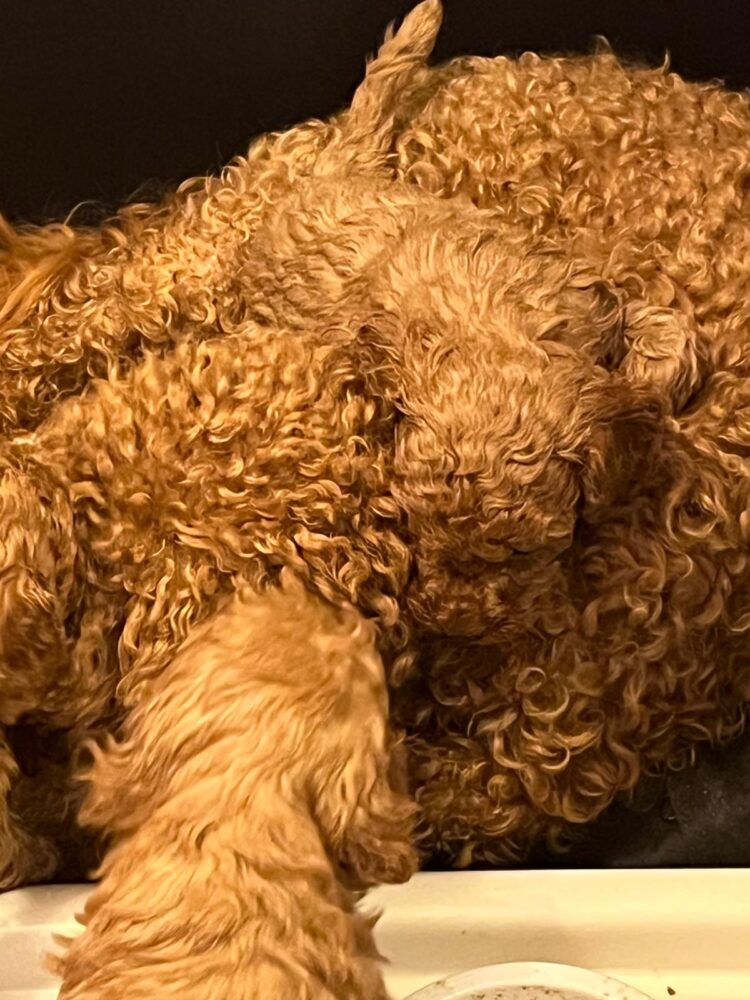 Die Mama ist ein Zwergpudel in fawn (Red Braun) und ist auf alle genetischen Erbrankheiten untersucht.