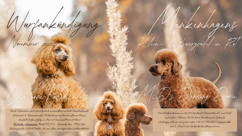 Vater: Caju vom Pudelschloss (https://www.mypudel.de/pudel-anzeigen/anzeigen/55578/deckruede-pudel-rot-vererbt-auch-loh-tan-laboklin-getestet-intern-champion-best-of-show-etc/pudel-deckrueden/)