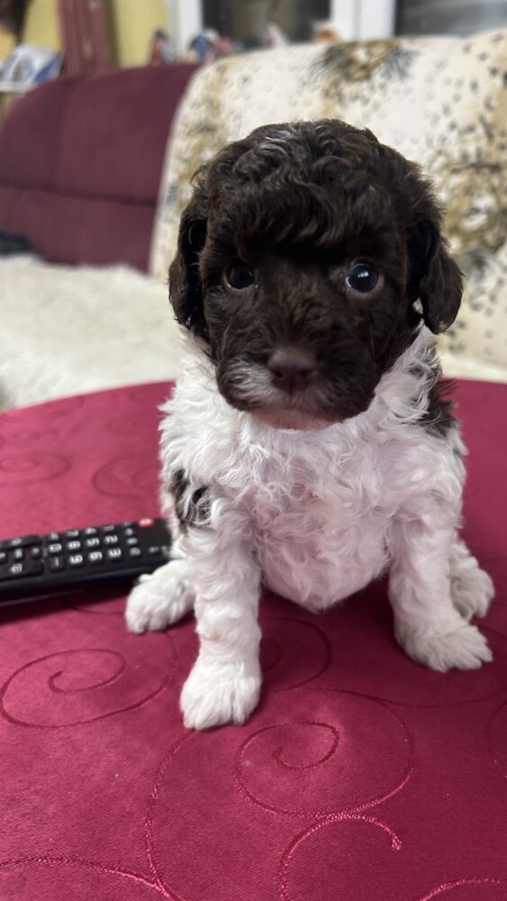 Einmalig schöne Harlekin Zwergpudelhündin 1 Hündin wie Abb. mit 4 Wochen in dunkelbraun/weiß ist ab sofort zu Besichtigen und zur Reservierung frei. Die Elterntiere sind Genuntersucht, Patella und Augenuntersuchung ECVO vom Facharzt.