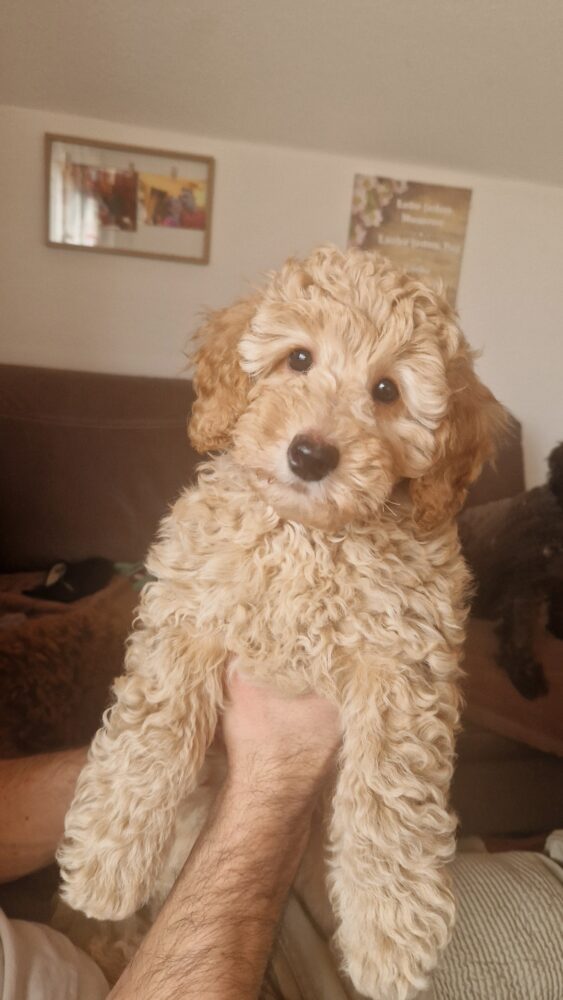 Mama ist eine apricotfarbene Kleinpudelhündin (35 cm Schulterhöhe), Papa ein wunderschöner Rüde in der Farbe Fawn (38 cm Schulterhöhe)