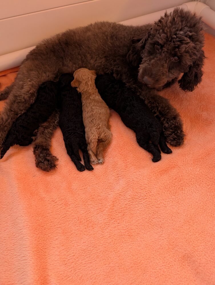 Mama ist eine braune Zwergpudelhündin und Papa ist ein Zwergpudelrüde in fawn. Die Elterntiere sind genetisch frei von rassetypischen Krankheiten, wie Patellaluxation, prcd-PRA und Katarakt. Sie sind beide zuchttauglich geschrieben und haben einen wesensfesten, liebenswertem Charakter, sind anhänglich und verschmust.